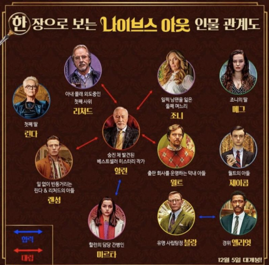 베스트셀러 미스터리 작가 '할런 트롬비'는 화려한 저택에서 살고 있었습니다. 그의 85세 생일을 축하하기 위해 온 가족이 모여 생일파티를 열고 즐거운 시간을 보냅니다. 하지만 바로 생일 다음 날 가족들이 맞이한 건 칼로 목이 그인 채 사망한 할런의 모습이었습니다. 할런의 죽음이 자살이 아니라 타살일 수도 있다는 의심을 한 경찰과 탐정 브누아블랑이 추도식에 찾아와 가족들을 탐문하기 시작합니다. 탐문을 계속해 나갈수록 화목한 가정인 줄 알았지만 가족 내에 문제가 가득하다는 것을 알게 됩니다. 할런의 첫째 딸 '린다'는 할런의 지원금으로 사업을 시작했고, 막냇동생인 '월트'가 아버지의 책으로 출판사를 운영해오는 것을 탐탁지 않아 하며 무시하고 있었습니다. 이 와중에 린다의 남편 '리처드'는 불륜을 저지르는 중이었고 이를 알게 된 할런이 린다에게 알리겠다고 한 상황이었습니다. 둘째 며느리 '조니'는 파산하고 딸인 메그의 학비를 할런에게 이중으로 받다가 걸려 할런은 앞으로의 지원을 모두 끊겠다고 선전포고하며 갈등이 있었습니다. 막내아들 월트는 할런의 책으로 출판사 사업을 하고 있는데 그의 판권을 영화나 다른 채널에 넘겨야 한다고 고집을 부리다 결국 할런에게 해고당하고 맙니다. 또한 린다의 아들 '랜섬'은 허세만 가득해 가족들과 사이가 좋지 않았는데 생일파티 당일에 할런과 말다툼을 한 후 일찍 집을 떠났습니다. 모든 인물이 정황상 의심이 가는 상황에서 경위 엘리엇과 사립 탐정 브누아블랑은 어떻게 범인을 잡을 수 있을지 확인하시길 바랍니다.
