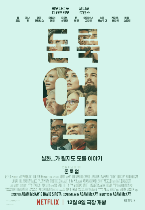 천문학과 대학원생 케이트 디비아스키(제니퍼 로렌스)와 담당 교수 랜들 민디 박사(레오나르도 디카프리오)는 태양계 내의 궤도를 돌고 있는 지름 10km 혜성이 지구와 직접 충돌하는 궤도에 들어섰다는 엄청난 사실을 발견합니다. 하지만 지구를 파괴할 에베레스트 크기의 혜성이 6개월 이내에 다가온다는 불편한 소식에 아무도 신경 쓰지 않습니다. 두 사람은 지구를 멸망으로 이끌지도 모르는 소식을 사람들에게 알리기 위해 언론 투어에 나서지만 아무런 소득이 없습니다. 위기 상황에 백악관에 초청되지만 백악관의 정치적 상황으로 대통령은 바쁘기만 하고 6개월 뒤 종말인데 일단 지켜보자는 황당한 답변만 듣게 됩니다. 브리(케이트 블란쳇)와 잭(타일러 페리)이 진행하는 인기 프로그램 ‘더 데일리 립’ 출연까지 이어가지만 가벼운 과학지식을 설명하는 식으로만 다루고 이에 폭발한 케이트는 방송에서 다 죽을거라고 소리치지만 이에 대해 심각하게 받아들이는 사람은 없습니다. 혜성 충돌까지 남은 시간은 단 6개월, 24시간 내내 뉴스와 정보는 쏟아지고 사람들은 소셜미디어에 푹 빠져있는 시대이지만 정작 이 중요한 뉴스는 대중의 주의를 끌지 못합니다. 고개만 들면 혜성이 보이는데도 '돈룩업'이라고 외치면서 죽고 사는 문제에 정치적 이슈를 만들어 시민들의 눈을 막는 미국 사회는 과연 이 재난에서도 살아남을 수 있을까요?