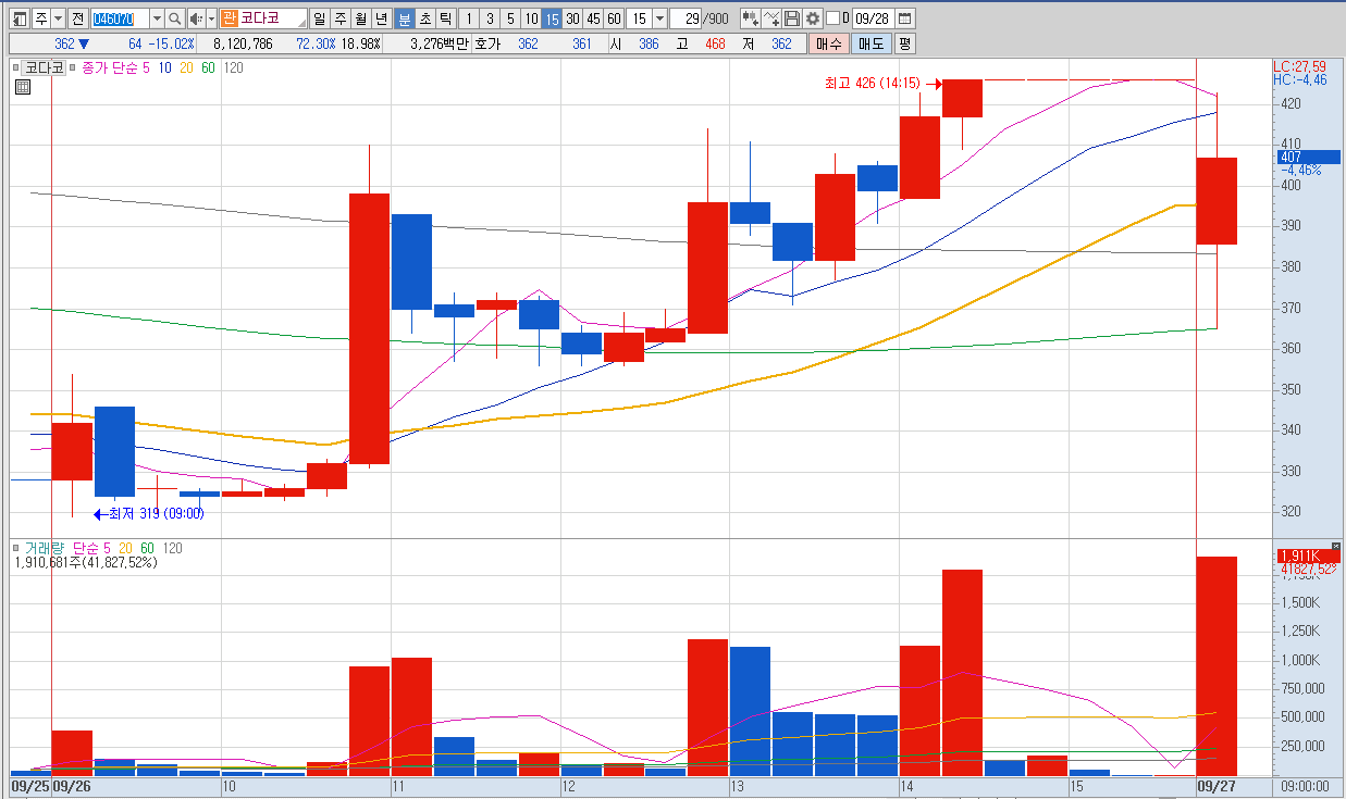 양일 연속 상한가 후 조정으로 추정
