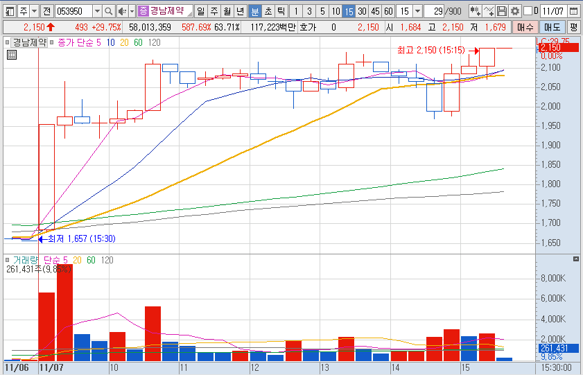 11/1에 거래 정지 풀린 후 주가 하락세 이어가다가 상한가, 아직 밝혀진 이유가 없음