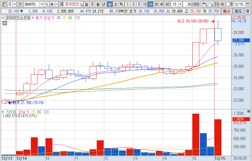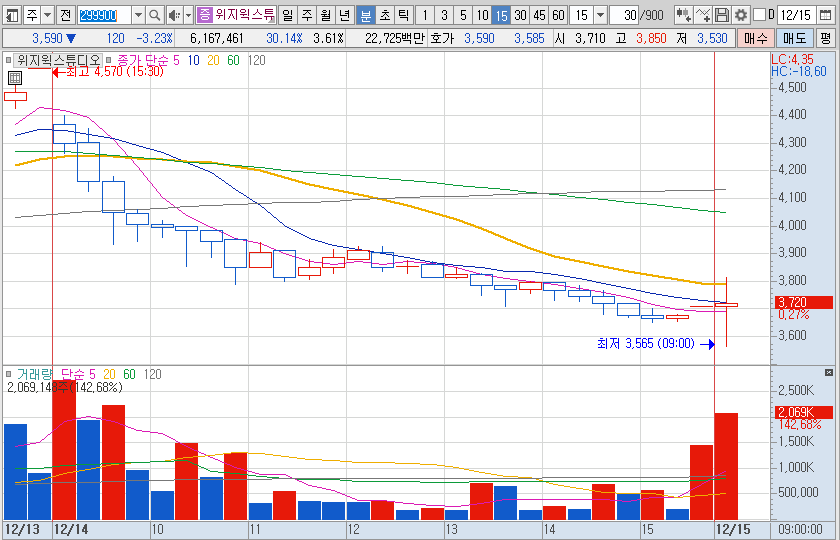 와이더플래닛과의 관계가 알려지며 주가가 상승했으나 상승분 반납하고 하락세 지속