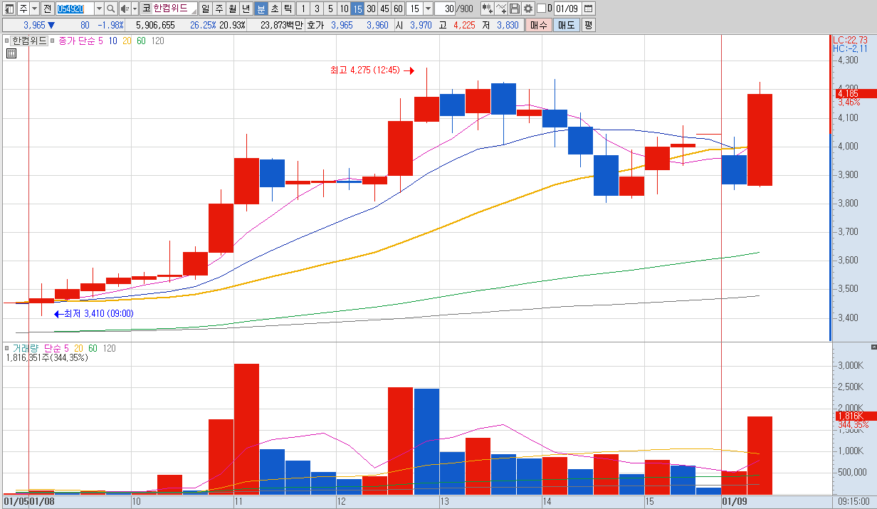 한글과컴퓨터가 생성형 인공지능(AI) 스타트업 '포티투마루'에 40억원의 전략적 투자를 발표해 상한가를 가자 한글과컴퓨터의 최대주주인 한컴위드 주가 상승