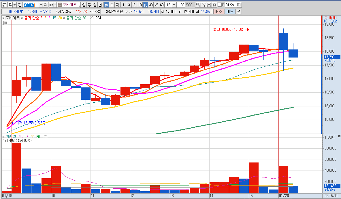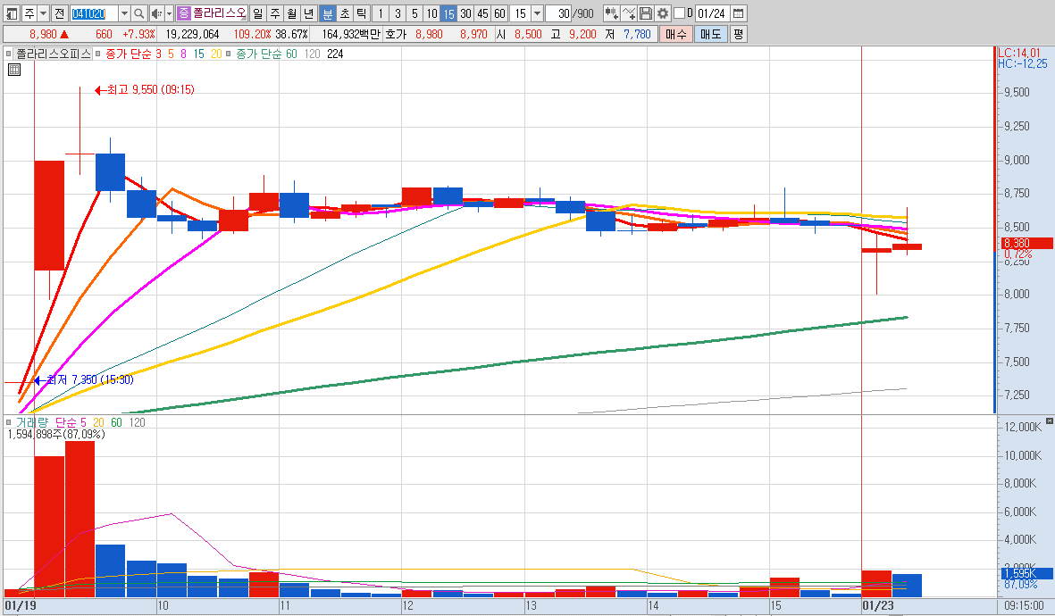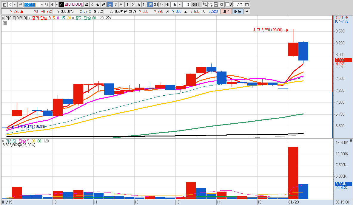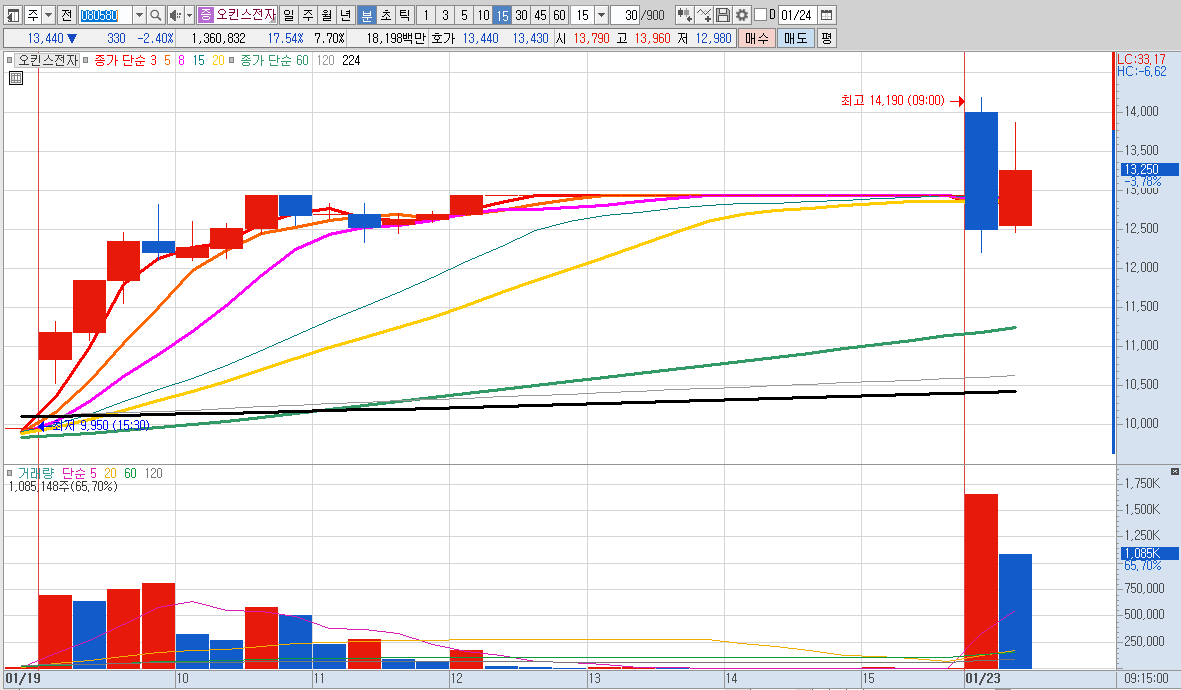 유기 2차전지 관련주로 충전과 방전 수명이 기존 2차전지 보다 5대 길고, 화재 위험이 없는 기술이 확보되었다는 소식에 상한가